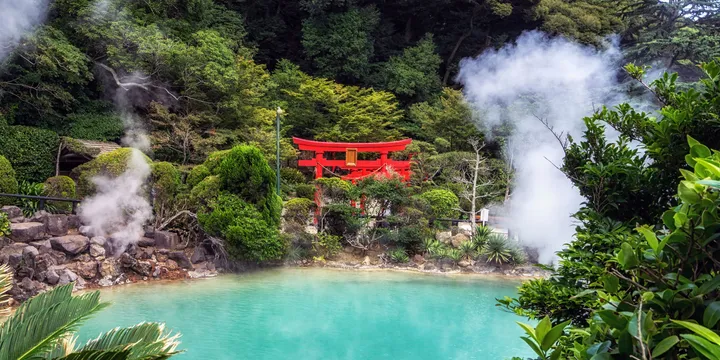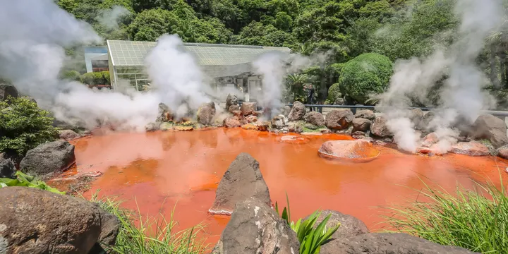 Nestled on the island of Kyushu, between Beppu Bay and a range of picturesque mountains, Beppu is renowned for its hot springs. These onsen, as they are known in Japanese, emerge from eight geothermal hot spots that together boast the second-largest volume of hot water in the world. Since Japan’s Edo period, the waters have been harnessed for curative and health benefits in soothing public baths. Outside the city, landscapes of steaming fissures and mineral-rich bubbling mud pools attract locals and visitors alike.